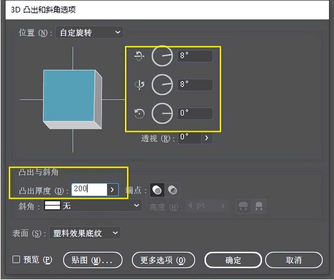 然后在菜单栏选择,效果→3D→凸出和斜角,面板中三个轴的参数,分别是8、8、0,凸出厚度为200: