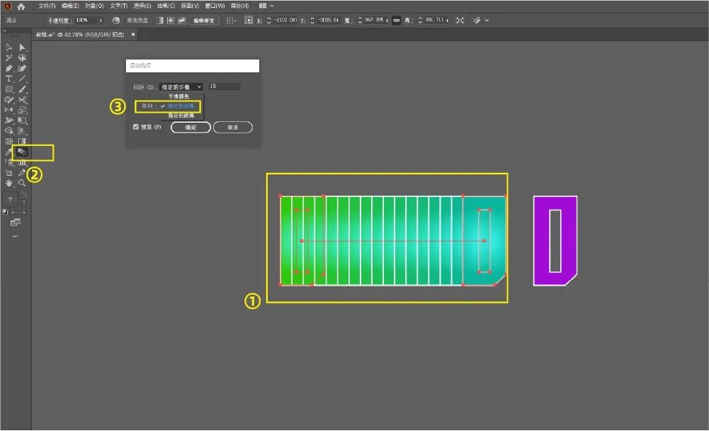选中混合后的字体,再双击混合工具,在面板中选中指定步数,步数15: