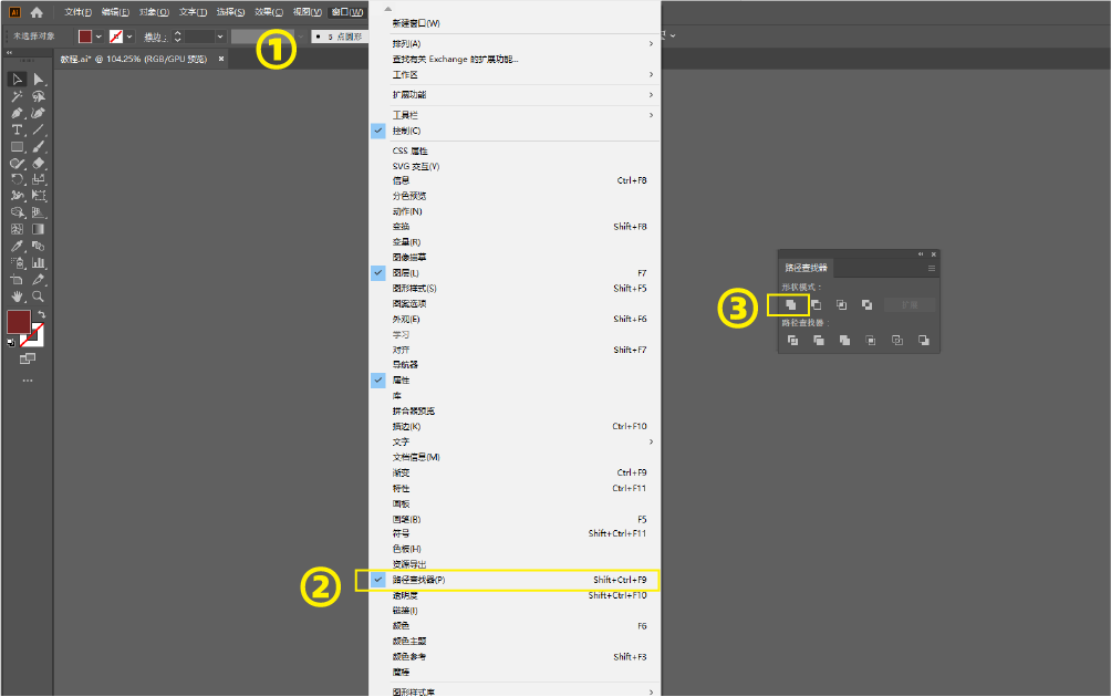 然后框选上面的字,在路径查找器点击合并,如果没有路径查找器面板可以在窗口中找到: