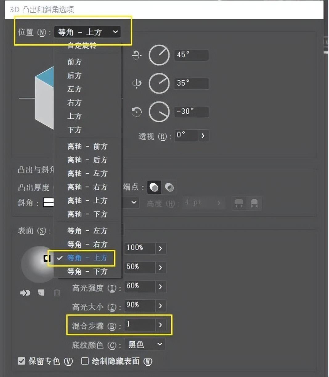 然后在菜单栏在菜单栏选择,效果→3D→凸出和斜角,在位置这里选择等角-上方,混合步骤改为1,其他参数不动: