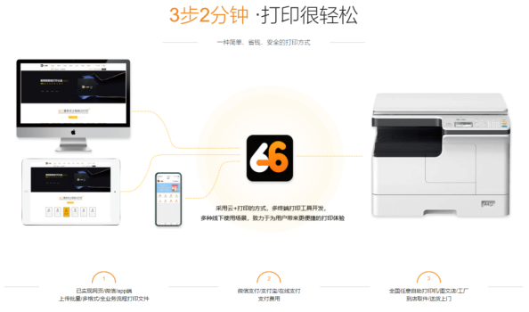 66印是一家智能云打印供应服务商,用户可通过66印公众号、官网页面或是在WPS Offie软件的应用市场中找到线上打印功能,上传文件、选择纸张规格和配送方式,3步即可轻松进行打印。