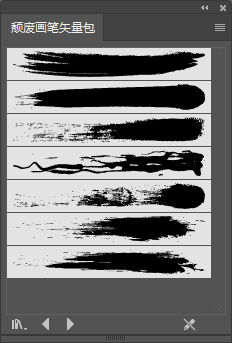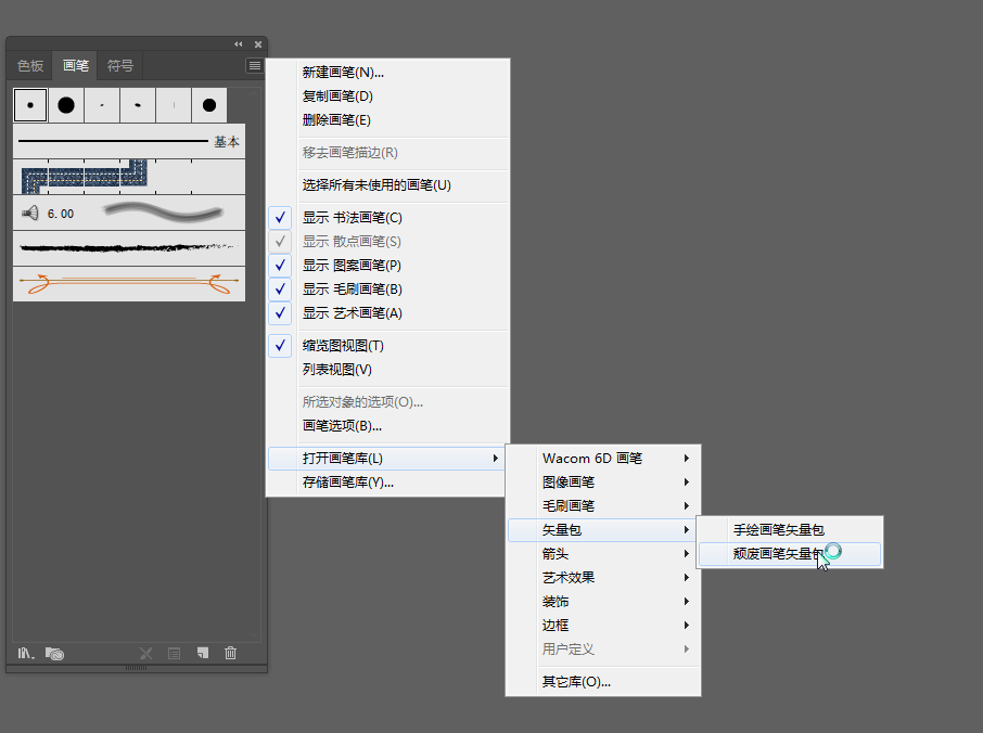 步骤三:调整之后选择画笔工具(或者按快捷键B),接着按F5打开画笔,然后打开画笔面板右上角的菜单,打开画笔库—矢量包—颓废画笔矢量包,最后弹出画笔面板如下: