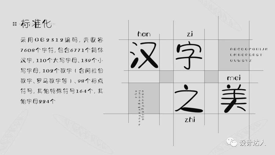 法棍体笔画有规律加粗和淡化棱角,汉字的折角使用了平滑曲线代替,字体看起来有点像卡通手写字,同时又具备可爱不笨粗的气质。采用GB2312编码,共收容7608个字符,包含6771个简体汉字,110个大写字母、139个小写字母,102个数字(含阿拉伯数字、罗马数字等)、98个标点符号,其他特殊符号164个,其他字母224个。