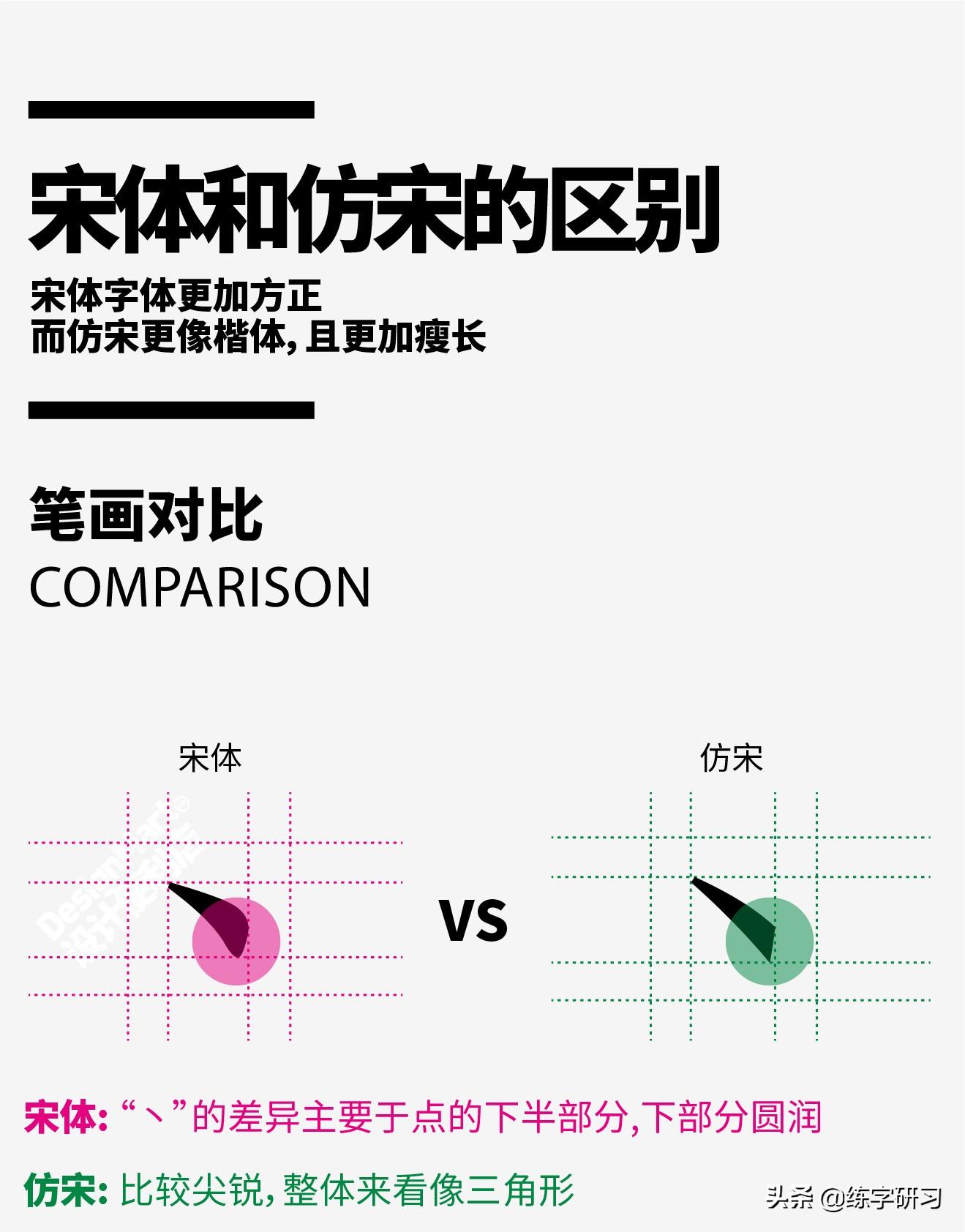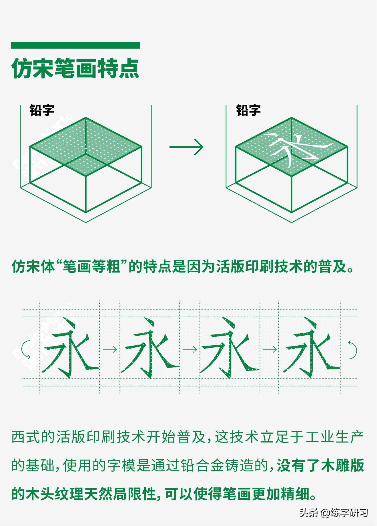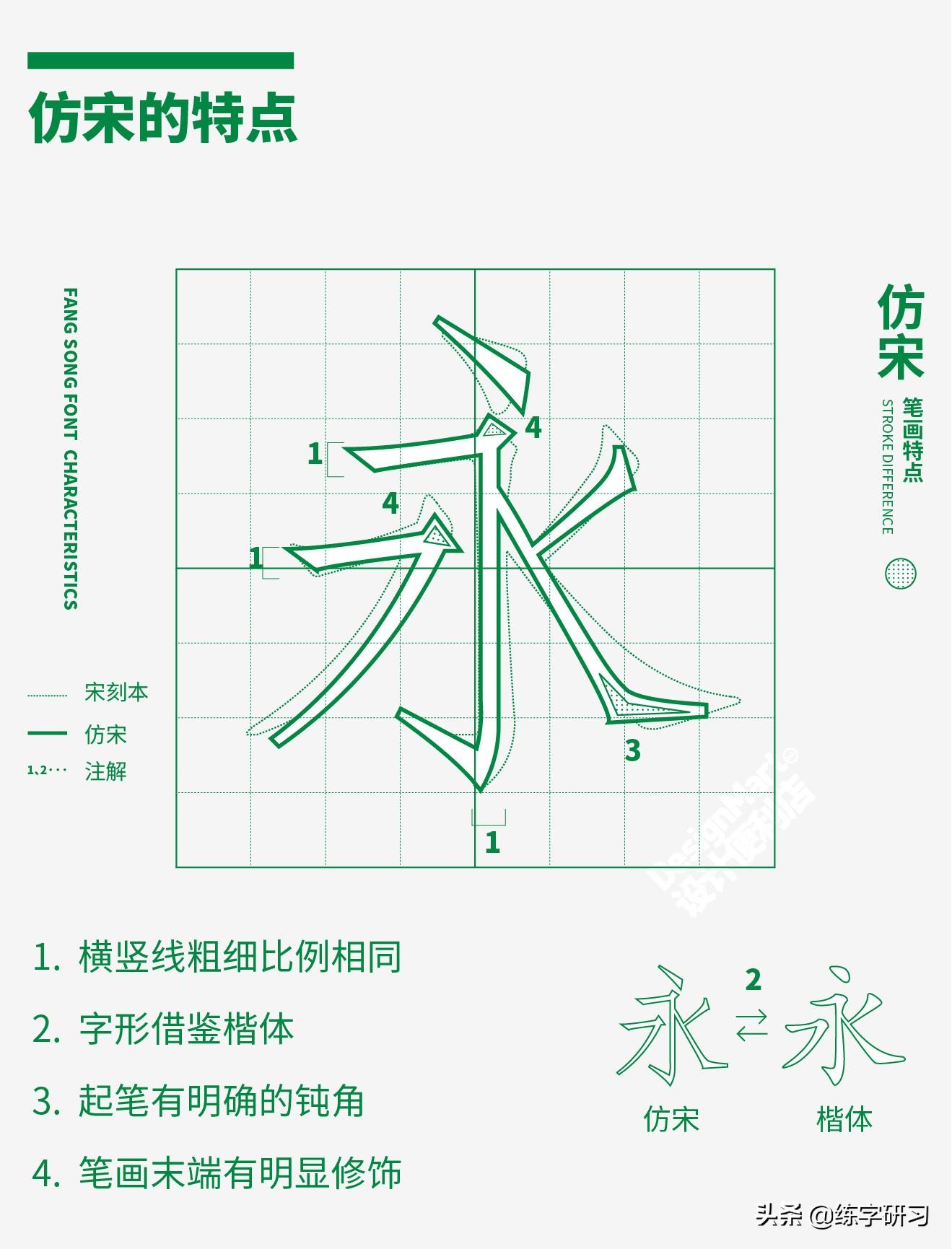 区别于宋体的横细竖粗,仿宋的笔划都是粗细相等,而且相较于其他字体的笔划来说宽度更细,这使得仿宋字号较小时辨识度依然很高。