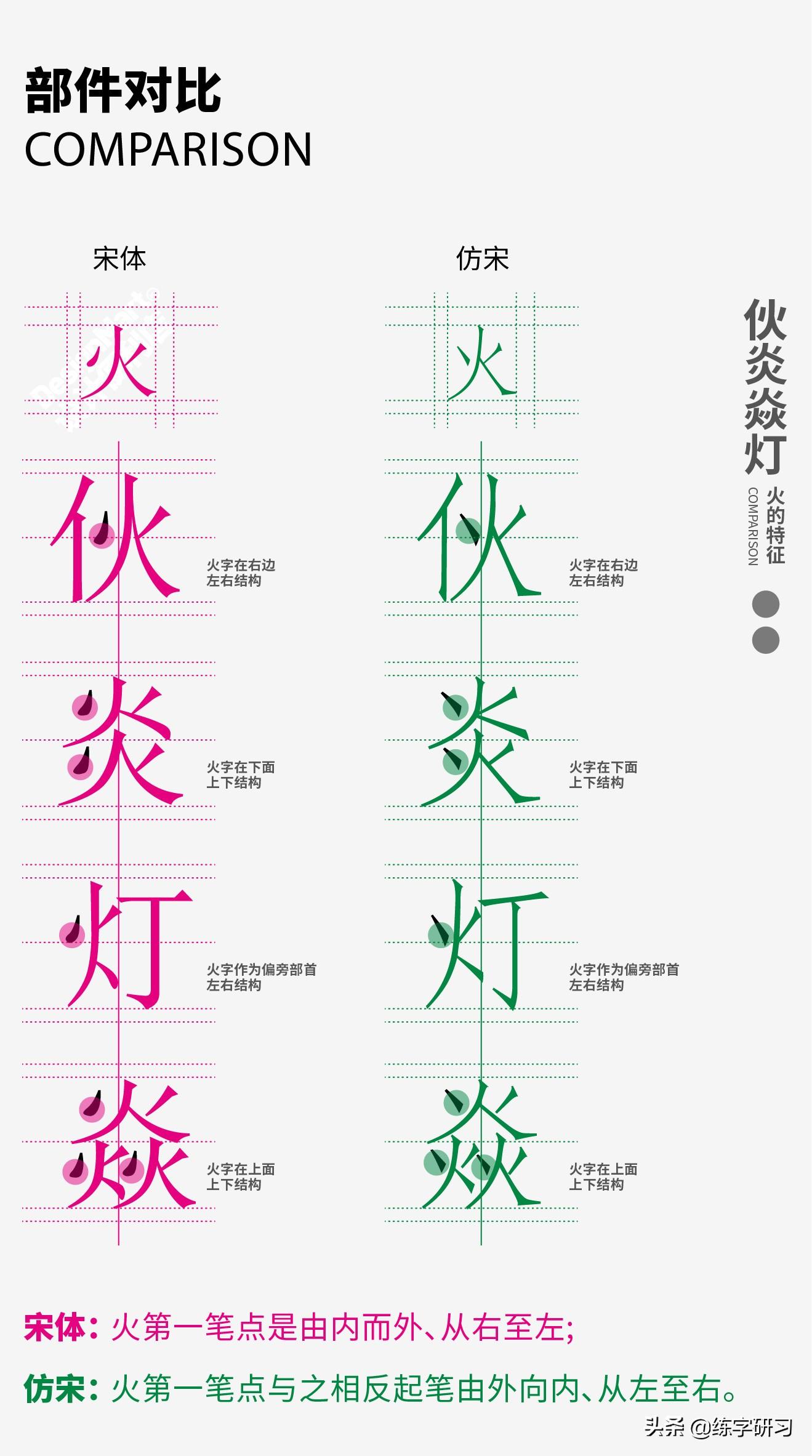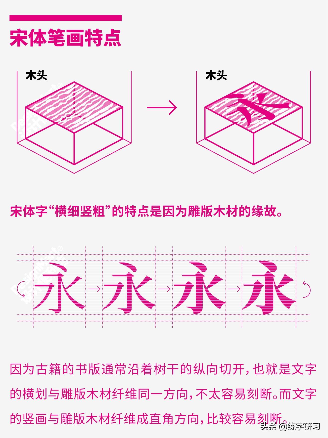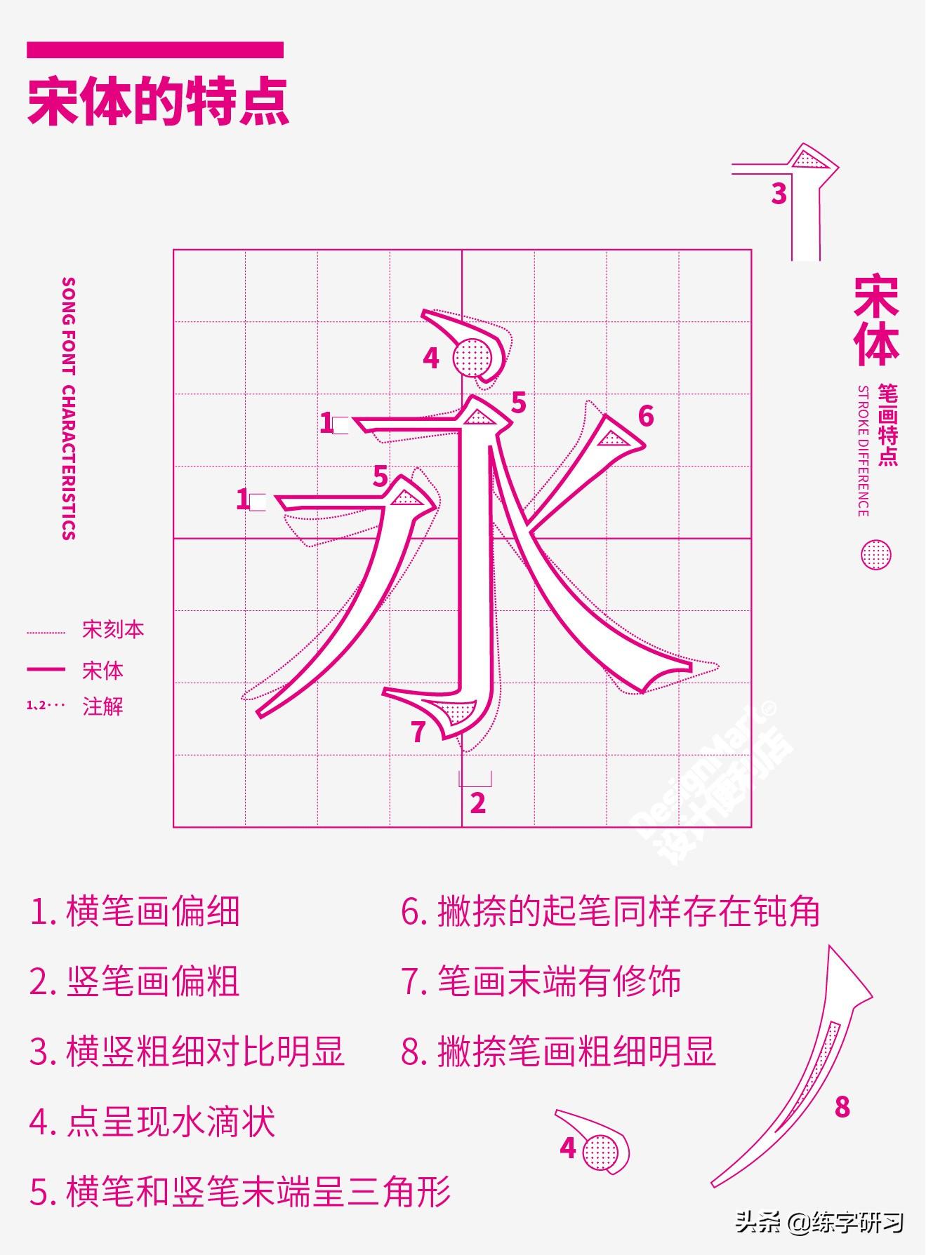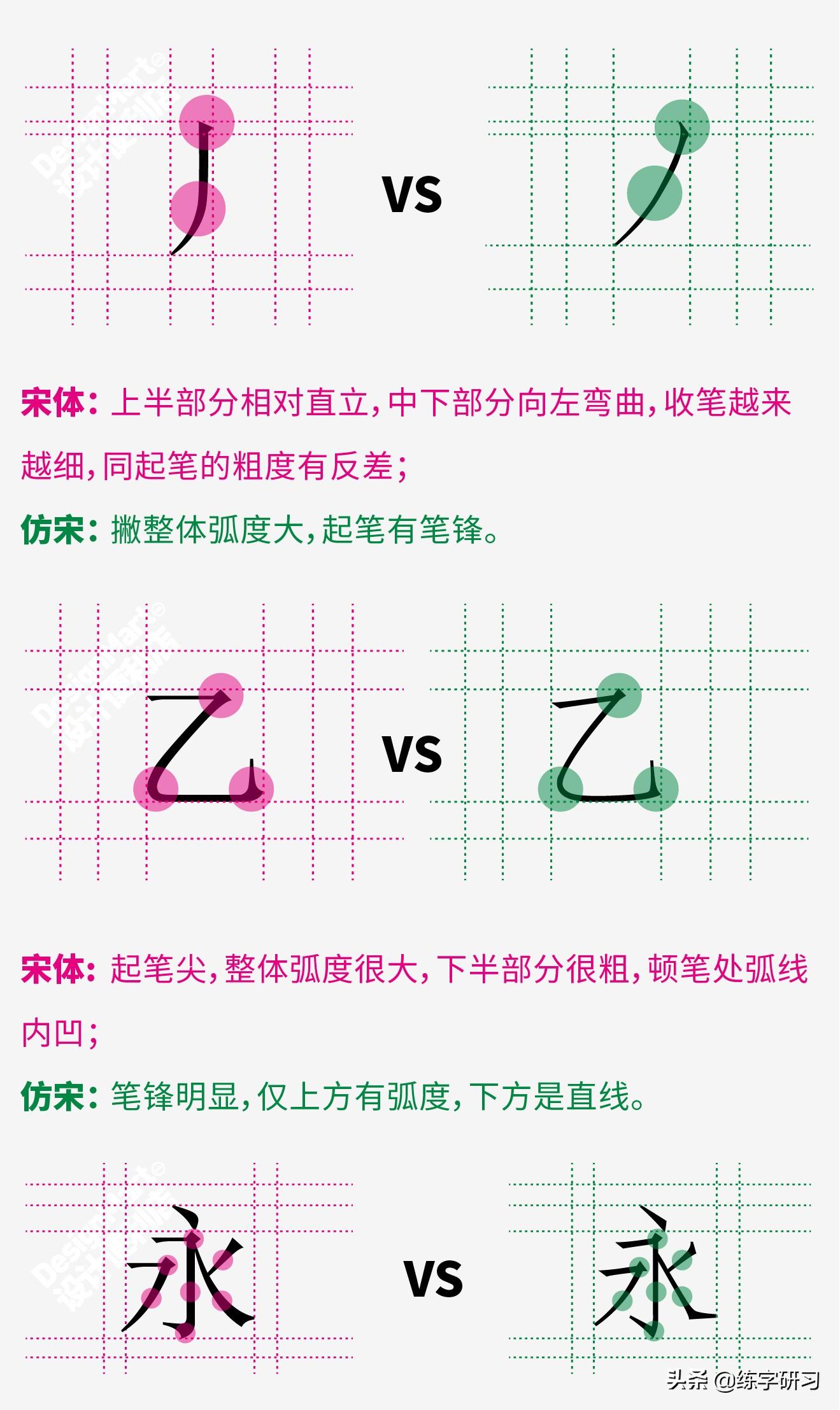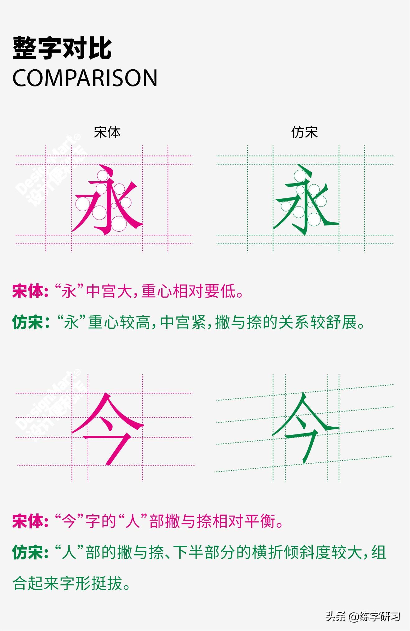 仿宋拥有楷体的笔型,笔划起落转折都有笔顿,横划左低右高倾斜状,点、撇、捺等都加长,书写意味明显。