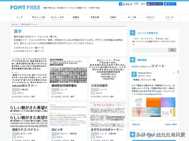 开启 FONT FREE 网站后,会显示近期更新的日文字体资源,不过这些日文字体无法正确套用于中文上,我们只要找收录「汉字」选项即可,点选带有汉字标签的链结或是网站下方的汉字标签,就能筛选出所有包含汉字的免费日文字体。