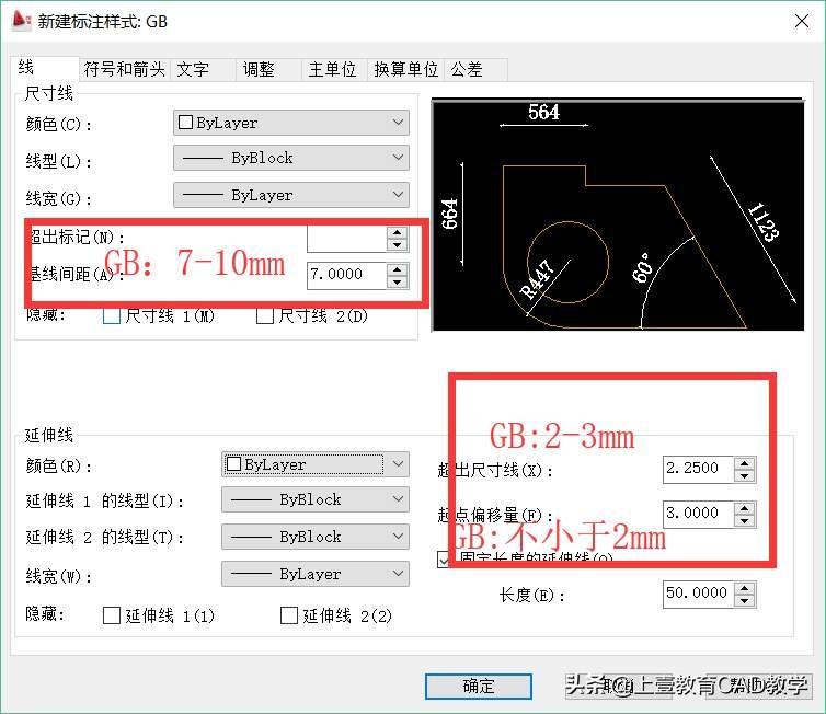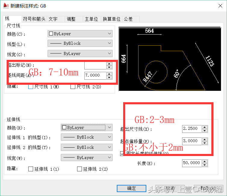 在“线”选项卡上设置尺寸线、尺寸界线等参数,如下图: