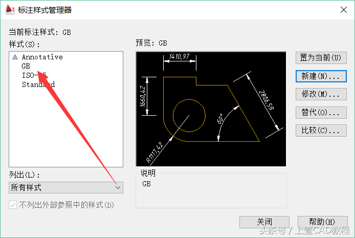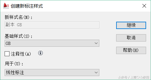 1、先将文字样式设置好(样式名:GB)。再打开标注样式管理器,新建一个标注样式,也叫GB。