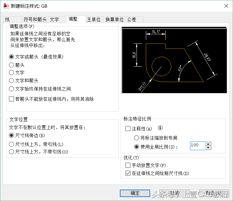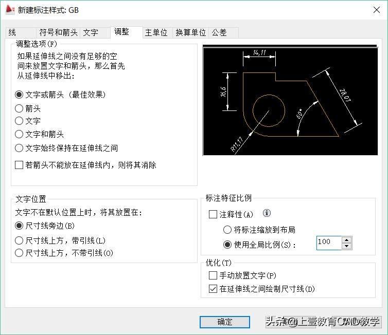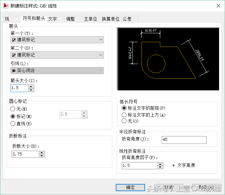 12、半径标注子样式和直径标注的设置完全相同。注:即使是建筑图,其直径、半径、角度仍用箭头。完成后如下图: