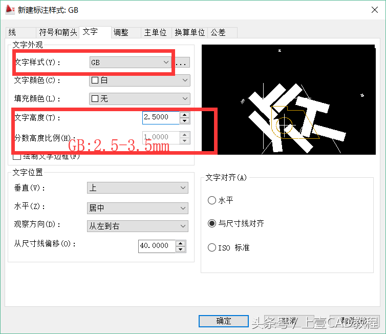 2、在“文字”选项卡中,文字样式选GB,文字高度2.5(GB:2.5-3.5),如下图: