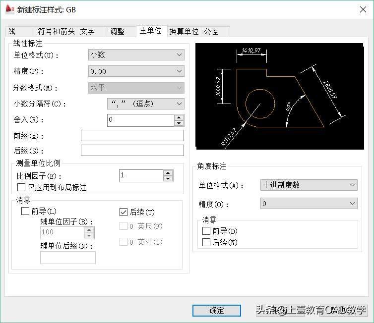 13、设置角度标注子样式:角度标注按国标要求文字水平书写,如下图: