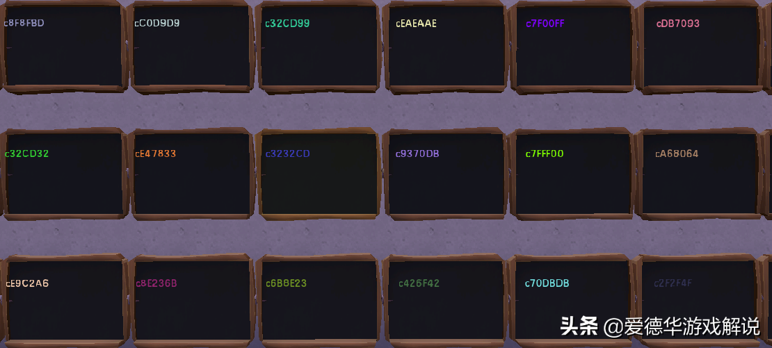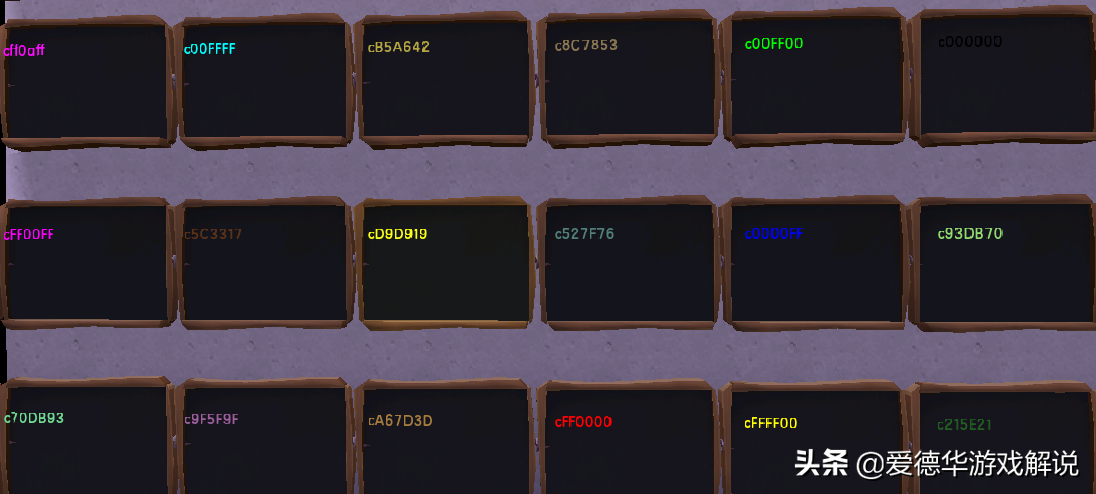 这里玩家输入了五种颜色的字体,看起来非常绚丽!本来想打造浮空彩色文字的玩家,却通过测试发现了迷你世界中字体颜色的上限,一共只有五种颜色,也就是上面的五种!其他的紫色、粉色、橘色并不能打出来!