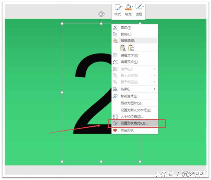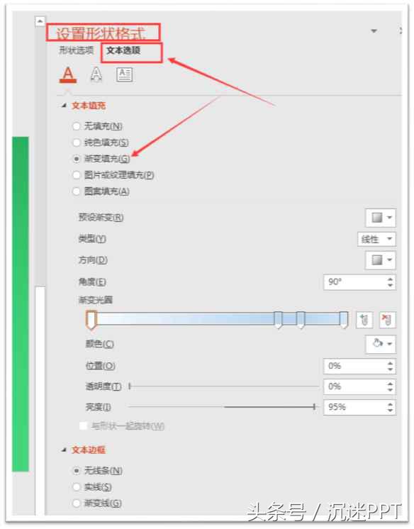 这是关键性一步,就是设置字体的渐变,在设置字体渐变时,大家一定要选择文本选项,不要选择默认的形状选项,不然就达不到字体效果。选择字体,点击鼠标右键“设置形状格式”-“文本选项”-“渐变填充”。