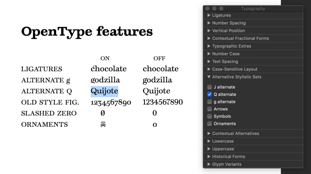 ▲ 在许多Mac应用程序中,“文字设计”的界面隐藏在“字体”界面的子菜单下,或者可以使用快捷键Command-T显示。如果找到这个面板,大多数的OpenType特性都能使用。Temeraire字体的文字设计功能在苹果的Pages(8.2版)中的样子如上图所示。