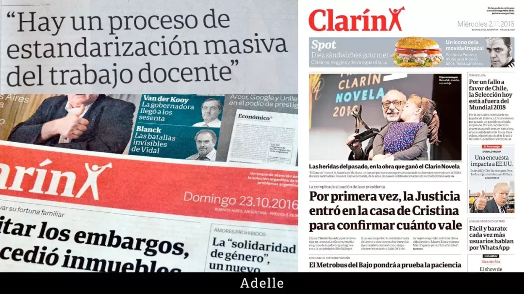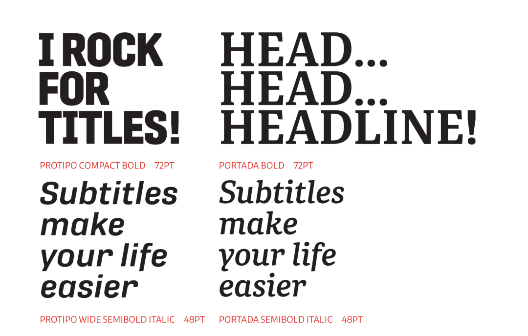 ▲ 对于复杂的语境,比如报纸、报告和杂志,一种可能性就是将两个具有兼容性的字体家族结合使用。如果它们包含不同层级的窄体,视觉大小,图画文字等,那再好不过。上图结合了Protipo和Portada的展示字体。这两个字体家族都可以在复杂的语境中,如信息图表、报纸、报告中协同工作。我们还推荐Tablet Gothic和Abril,当然,还有Adelle和Adelle Sans.这两个超级字体家族。