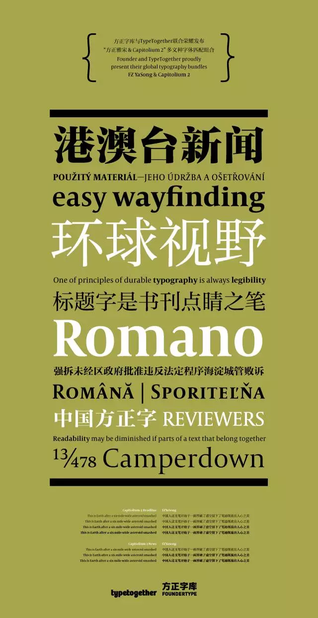 方正字库与Typetogether携手推出32套中西文字体匹配方案,不仅设计规范、风格多样,考虑了与方正字体的匹配问题,还支持110多个西欧主要国家的官方语言,满足国内设计师选用西文字体的需求,减轻设计师在中西文混排时的困扰。