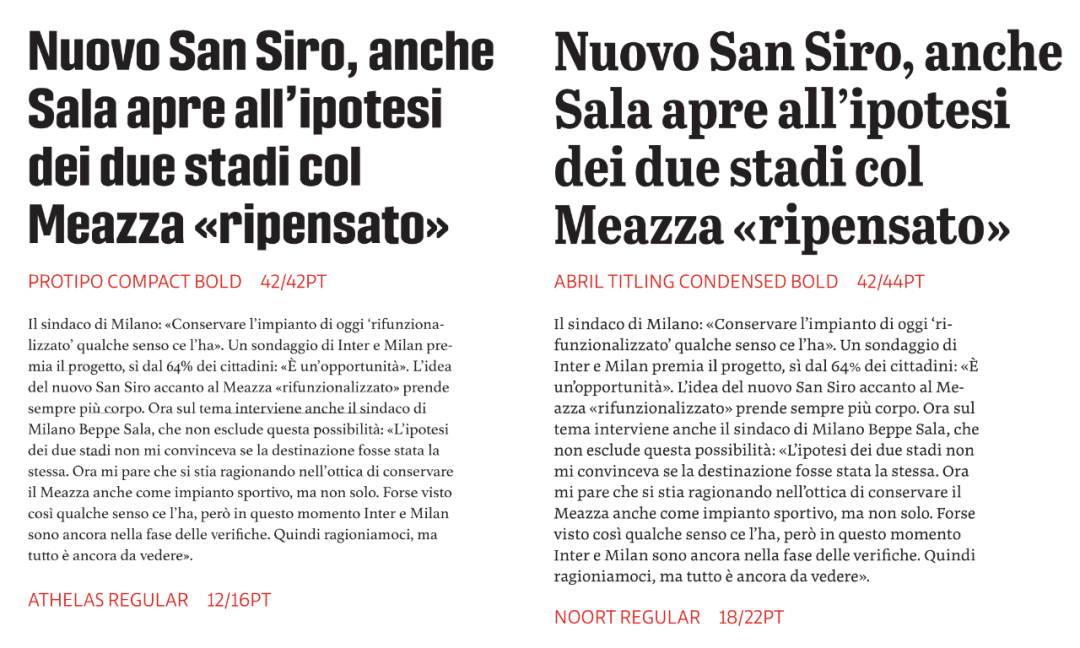 ▲ 在上面的标题中,Protipo Compact 和Abril titling Condensed 是两个字体家族范例,它们都兼具短下伸部和瘦长的特点,使得标题在视觉上多多少少成为紧凑的文字块。但是Athelas和Noort是为长文本而设计的:字腔开放,笔画粗细对比低,有强有力的笔画端点等等。其实这两款字体都是为相同的语境设计的,但是效果不一样:不同的版面肌理、不同的版面灰度、不同的字母间的负空间。