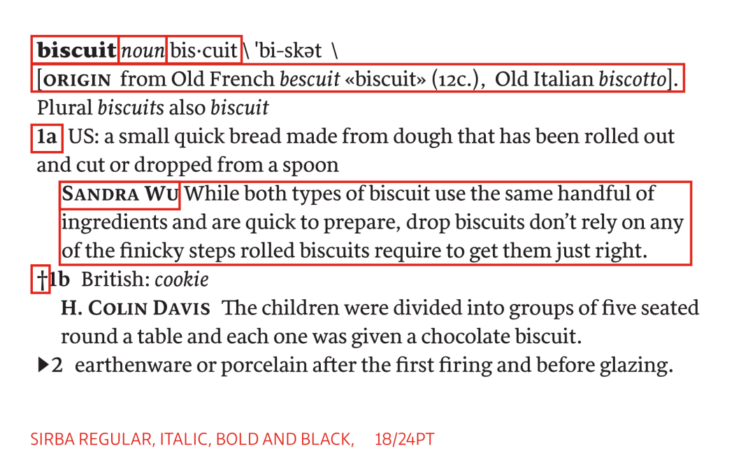 ▲ 图为字典条目的文字设计剖析,显示了这类出版物的复杂性。通常需要使用多种变体(意大利体、粗体、小型大写体以及装饰图形),每个变体都增加了一层新的知识和内容。图片来自Nicolien van de Keur 对于字典上小字号文字设计的研究,该论文发表在《字体设计硕士学位论文》Master in Typeface Design上。