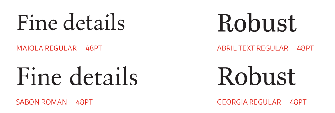 ▲ Maiola和Sabon的精美细节在高精度印刷中表现更好,而Abril和Georgia有结实的笔画端点,笔画粗细对比度低,可以更好地处理低分辨率的情况。