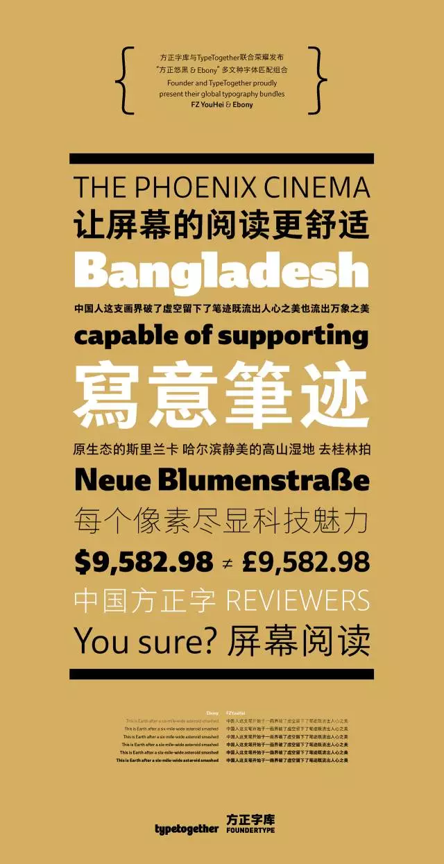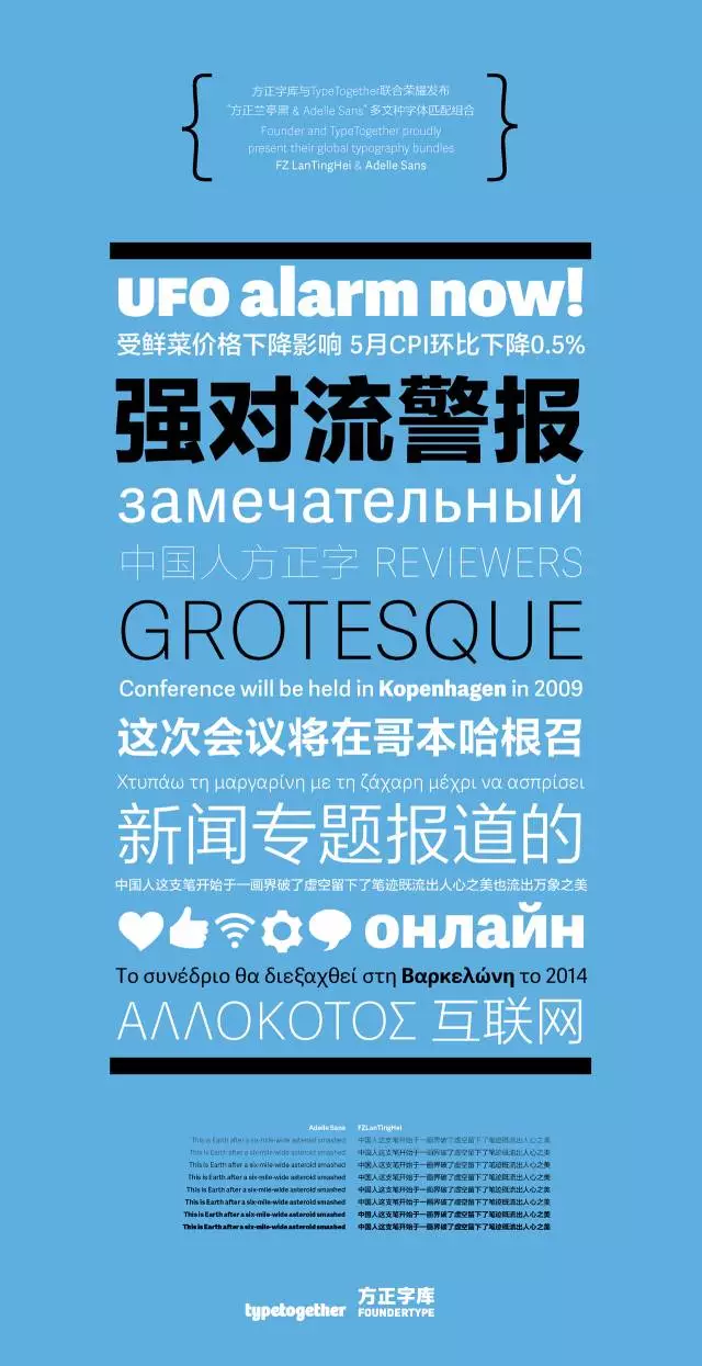 在设计全球化的今天,国内的设计师对西文字体的应用需求与日俱增。如何选择与设计作品定位契合的西文字体?如何兼顾中西文字体的匹配问题?如何更便捷的购买西文字体并获得相应服务?这些都是摆在国内设计师面前的现实问题。在此契机下,方正字库与知名字体厂商Typetogether 达成了全面的合作。