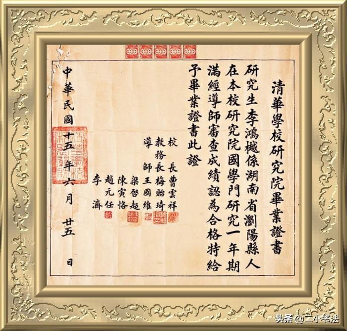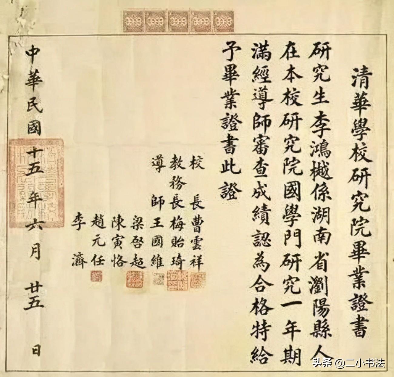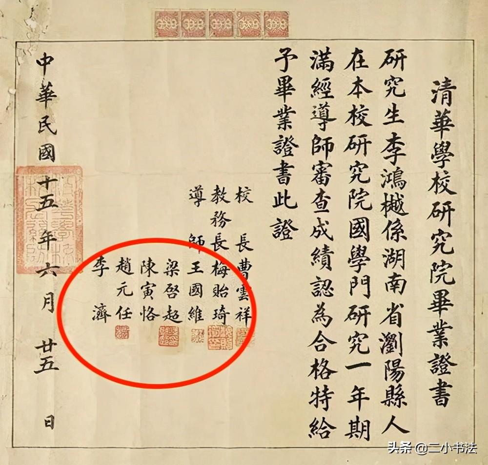它是由清华大学(民国)导师王国维、梁启超、陈寅恪、赵元任和李济,外加教务长梅贻琦、校长曹云祥联名签发的。