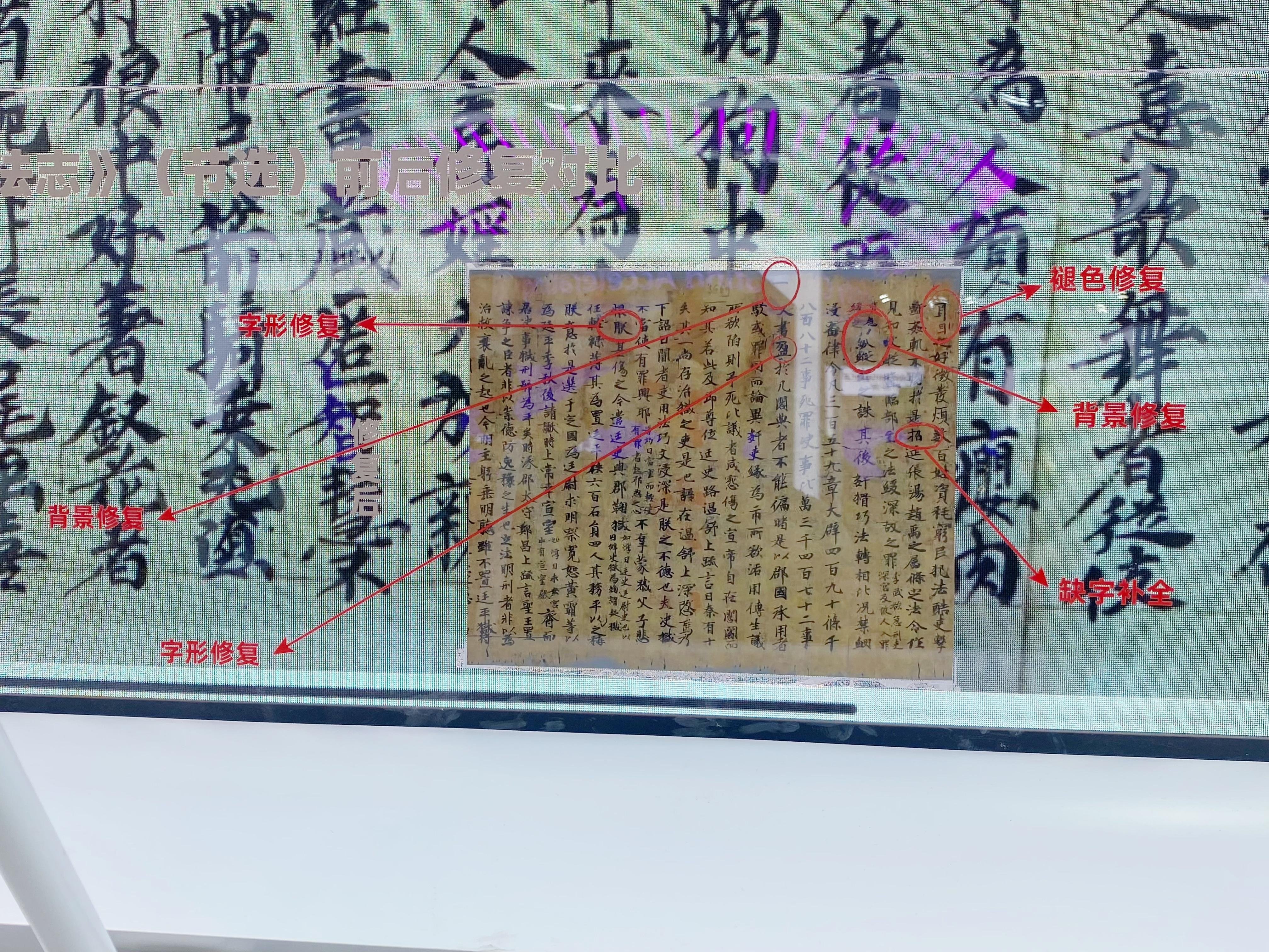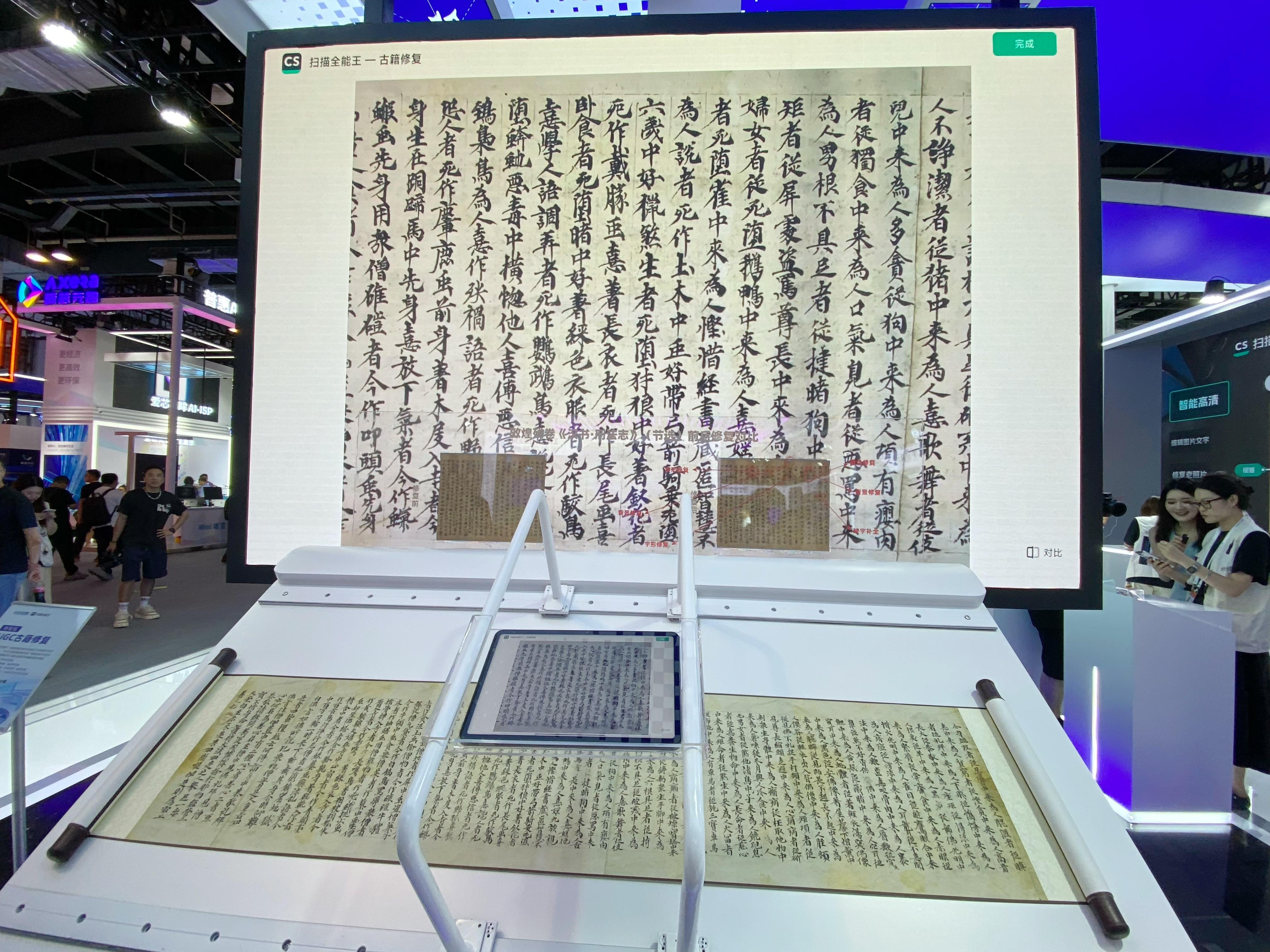 “你可以看一下,随着我们滑轴的移动,(敦煌遗书)样本卷轴的不同地方是有不同程度的缺损的,然后我们可以点击滑轴上AI古籍修复模型的操作功能按钮,就可以开启修复工作。进行图像处理之后,AI就会识别目前你想要修复的区域并进行自动定位,定位完之后,自动判断这一区域需要修复的缺字或者字迹污损难辨认情况,修复完之后实现1:1的还原。” 合合信息展台工作人员说,在修复时,AI古籍修复模型还会自动学习原版古籍的文字、笔画风格(书法字体),以及页面纹理,把缺损的文字按照原来的字体、色彩、背景加以修复还原,且能够做到天衣无缝、看上去没有“违和感”,在最大程度上确保了修复区域的文字风格和背景与原古籍的一致性。