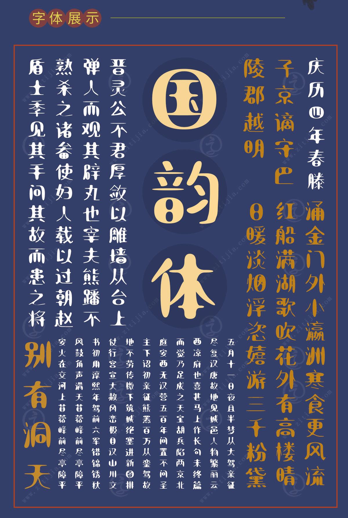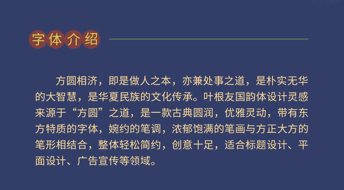 叶根友国韵体设计灵感来源于“方圆”之道,是一款古典圆润,优雅灵动,带有东方特质的字体,婉约的笔调,浓郁饱满的笔画与方正大方的笔形相结合,整体轻松简约,创意十足,适合标题设计、平面设计、广告宣传等领域。