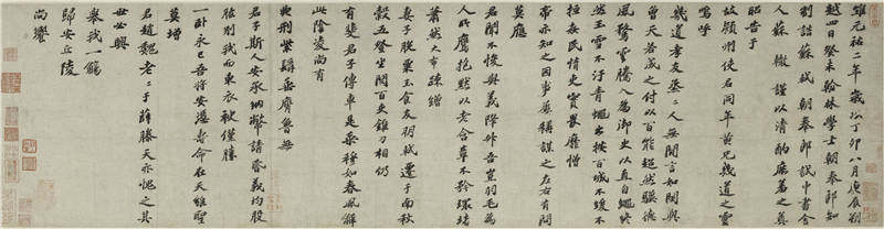 此卷是苏轼墨迹中的楷书代表作。清朝书画家笪重光于帖前有隔水题签:“此则纯用楷法,出入晋唐之间,古雅道逸,与褚河南、颜平原册文手书流传海内。同一墨宝,信艺林之名迹,操觚之师范也。”全卷笔锋隐藏,点画厚重,线条凝练,呈恭谨厚重之风。后半帖,墨色愈发浓重,字体亦渐大,仿若一曲越奏越悲的挽歌。