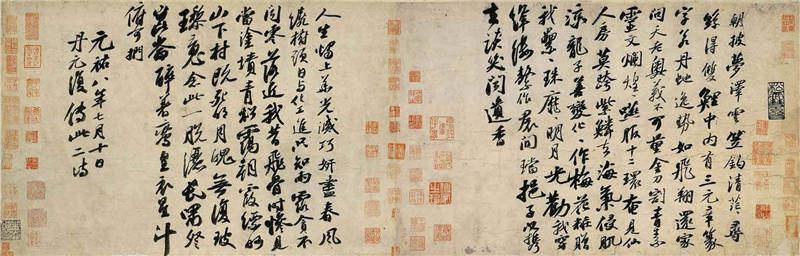 元祐八年夏,即使对命运坎坷的苏轼来讲,也是生命中格外阴郁的时刻。家中,相伴25年的贤妻王闰之病重,于八月一日溘然长逝;朝上,尽心教育的哲宗皇帝不改暴躁懒惰,在高太后亡故后自行其是。心灰意冷的苏轼再请外放,于赴任定州前夕写出《李白仙诗帖》。据《东坡题跋》载,此帖所录两首诗为来访的道人丹元子口述,属李白遗诗。虽真伪存疑,但两诗超脱物外的空灵气象似乎尤为符合苏轼此时倦于朝政、意欲出世的心境。