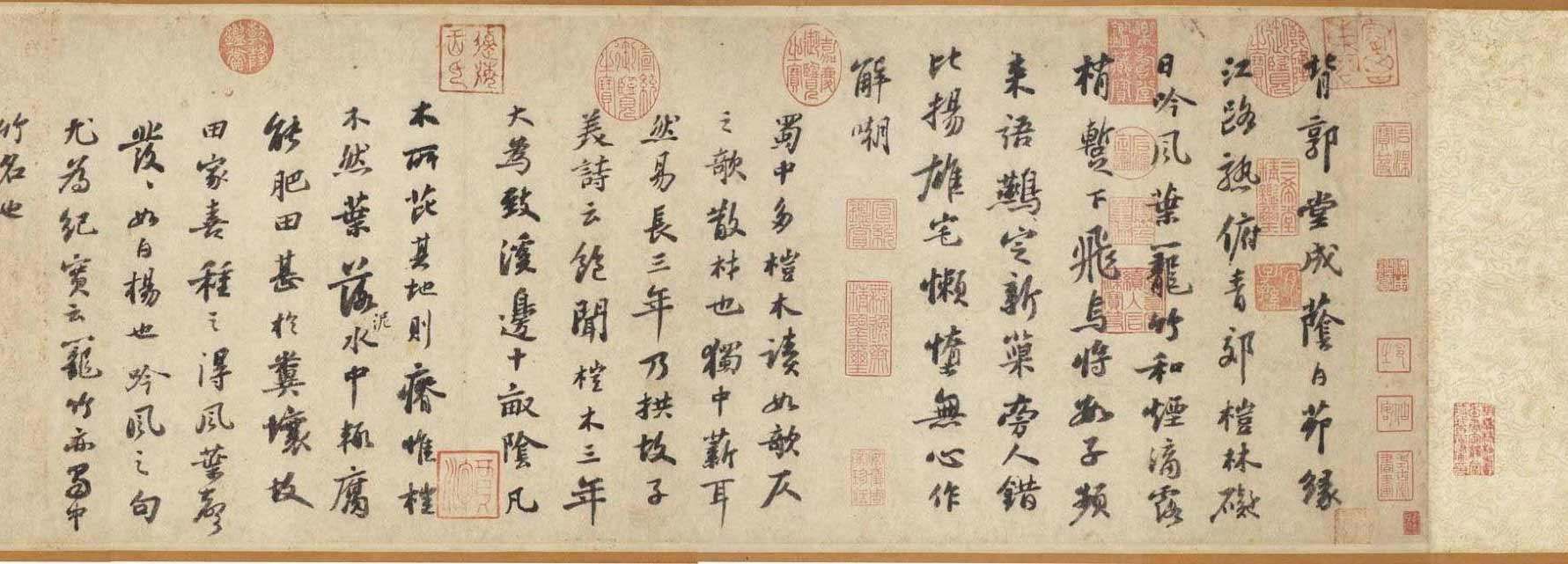 《杜甫桤木诗卷帖》一卷,苏轼摘抄了杜甫的七言律诗《堂成》。全卷无东坡名款,有清乾隆、嘉庆、宣统御览之宝等大小印章数十方。苏轼一生抄录他人诗歌不多,杜诗《堂成》的特殊或许在于其意象况味与黄州的生活格外贴切。公元760年暮春,中年杜甫携家小在战乱中流转各处,终落脚成都修成草堂。除了寄寓他乡的相似心境,苏轼在跋语中写的全是诗中所提蜀中桤木,对于家乡思而不得返的怅然之情足见一斑。