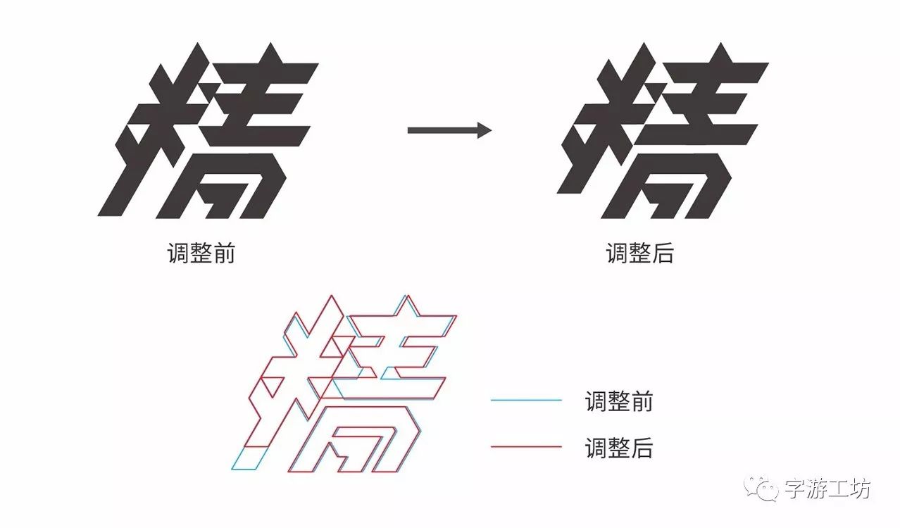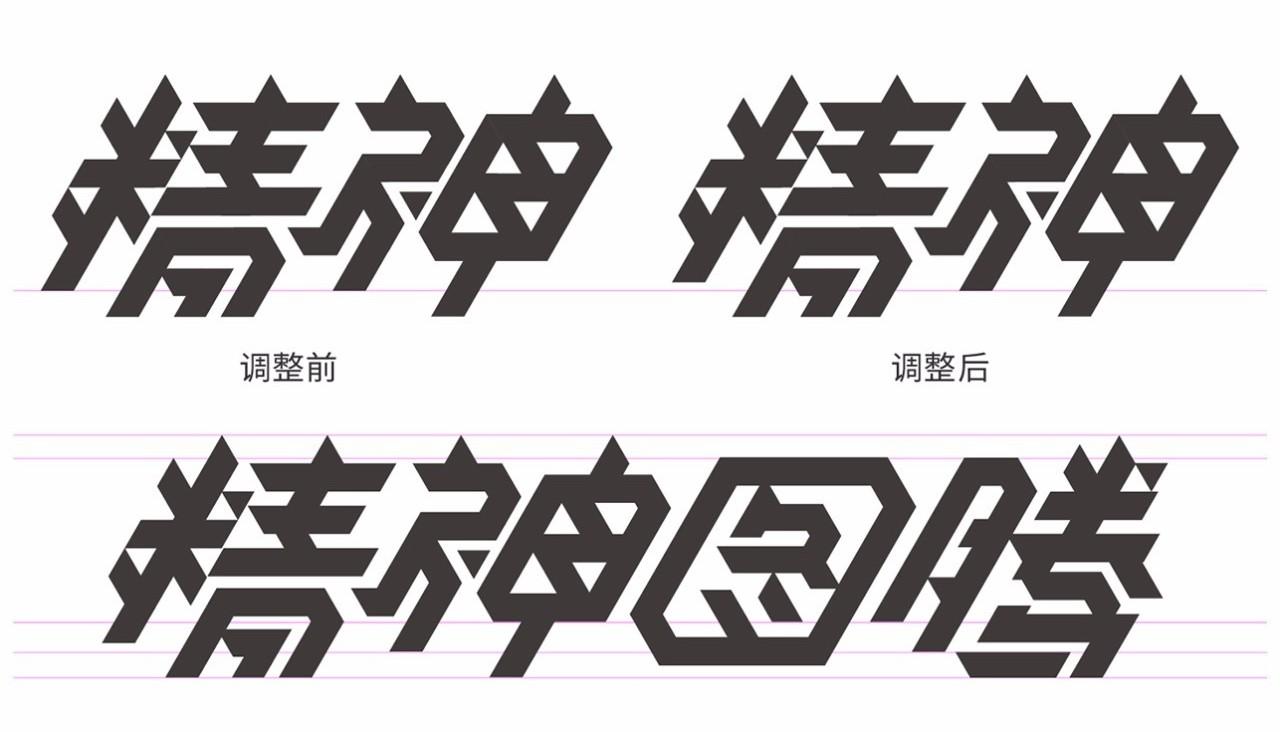 而后,将其他的字使用基础笔画拼合起来,尽量使得字本身、字与字之间显得饱满和谐。“精神”二字通过笔画之间的添补使得字与字之间饱满了,同时细微的调整也会使得字形更加的耐看,上图可见只是“米”字旁轻微的调整,就解决了视觉上不齐整的问题 。(调整前在视觉上“米”字旁竖画长了些,调整后工整了许多)