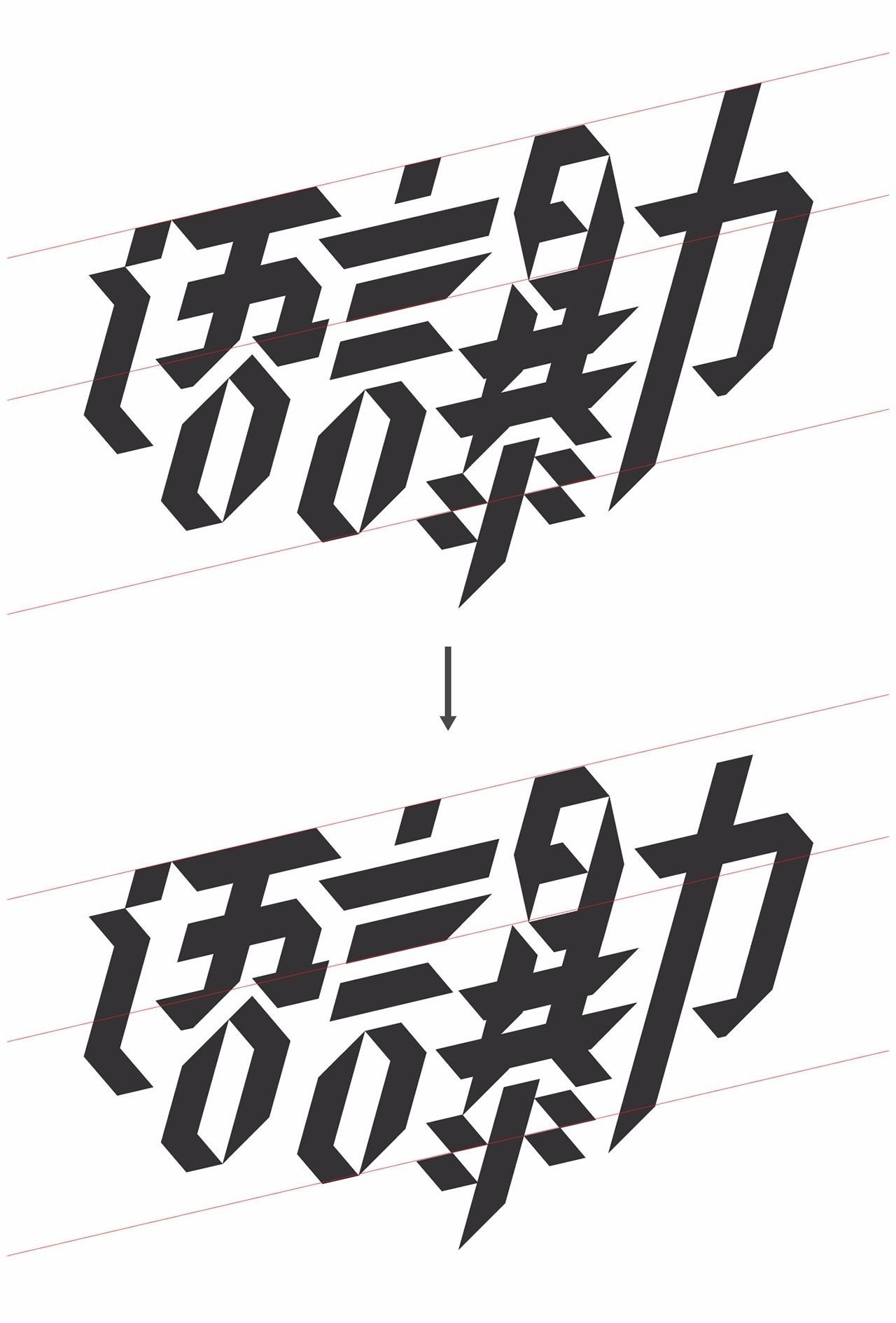 找到一些对齐的方式,着重对“力”字进行高度的调整,使整体更加协调些。