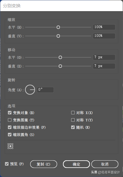我们选中所有的文字,然后右击选择“变换”-“分别变换”,设置参数如下图: