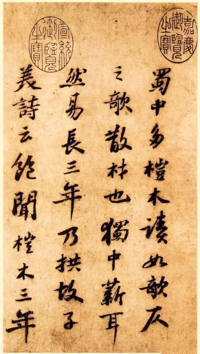 东坡少时,规摹徐会稽……中年喜临写颜尚书,真行造次为之,便欲穷本。晚乃喜李北海书,其豪劲多似之。……中年书圆劲而有韵,大似徐会稽,晚年沉著痛快,乃似李北海。
