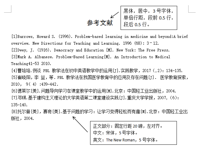 1、“参考文献”四个字格式为4号黑体,后接冒号。参考文献的具体内容为5号宋体。书写时需另起一行,书写顺序为:(中文)作者--标题--出版物信息,或者(英文)...1...