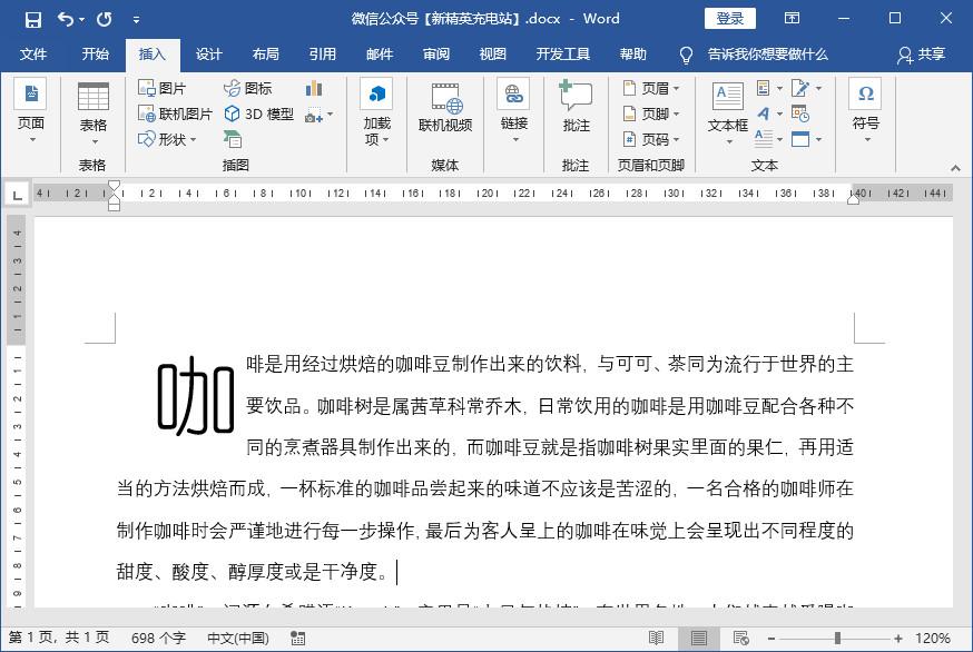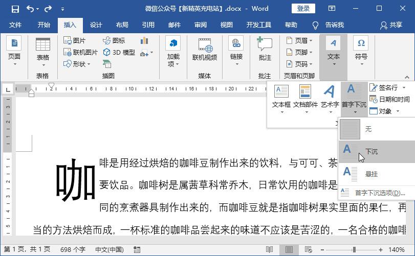 将光标放到需要设置首字下沉的段落中,然后在【插入】选项卡下单击【首字下沉】按钮,从中选择样式,例如这里选择了【下沉】这种样式,就可以了。