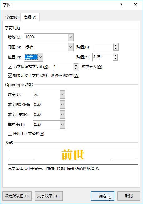 用同样的方法,选中"今生"二字,设置它们的位置为【下降】,目标是让这两个字的位置低于标题的其他文字。最终效果如下图所示,标题实现了"七上八下"的波浪效果,减少了文档的呆板程度。