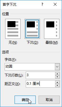 如下图所示,是设置下沉字体为【幼圆】,下沉行数为【3】,距离正文【0.1厘米】的效果。