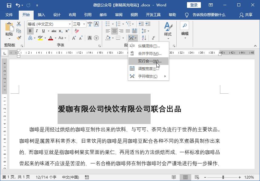 这时选中的文字就实现了双行合一的效果,如下图所示。