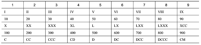 3 小的数字(限于 Ⅰ、X 和 C)在大的数字的左边,所表示的数等于大数减小数得到的数,如 Ⅳ=4、Ⅸ=9;