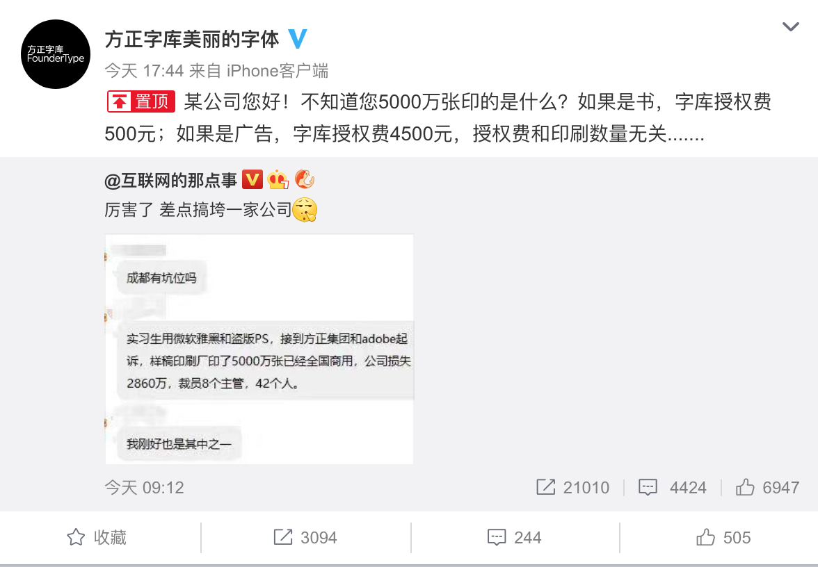5日, 有微博大v爆料称,一公司因使用微软雅黑和盗版PS,印刷样稿5000万张,被方正集团和adobe起诉,公司损失2860万,裁员42人。5日晚间,方正字库官微辟谣称,书籍类字库授权费为500元,广告类授权费4500元,且与印刷数量无关。