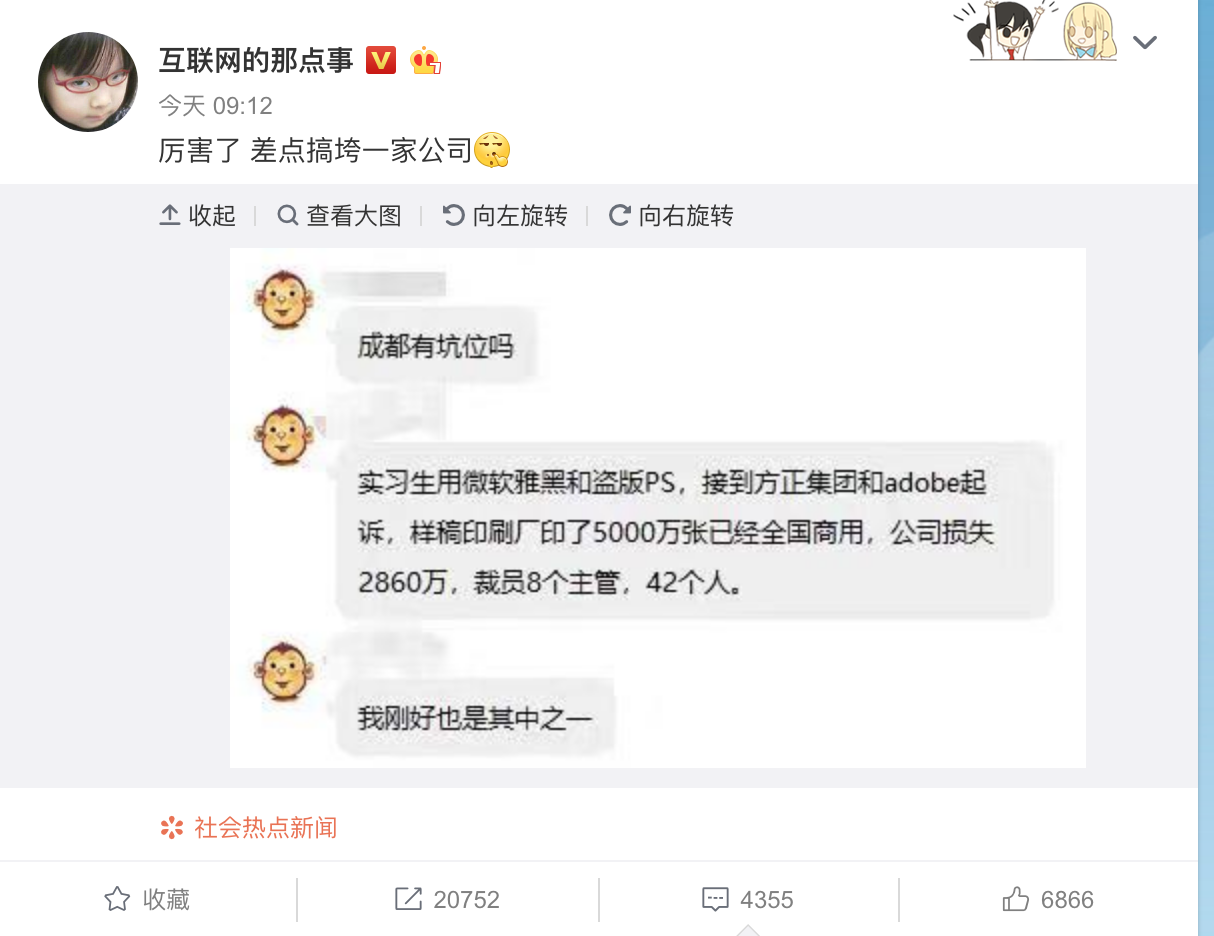 5日早间,微博名为“互联网的那点事”发博称,“厉害了,差点搞垮一间公司”,配图为一位爆料者称,某公司实习生使用微软雅黑和盗版PS,接到方正集团和adobe起诉,样稿印刷厂印了5000万张已经全国商用,公司损失2860万,裁员8个主管,42人,这位爆料者表示自己也是被裁掉的一员。