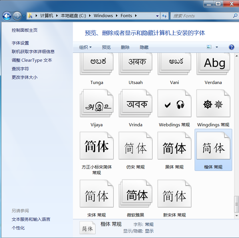 将打开操作系统的字体库,在微软操作系统中,目录一般是C:\Windows\Fonts,打开后如下图:
