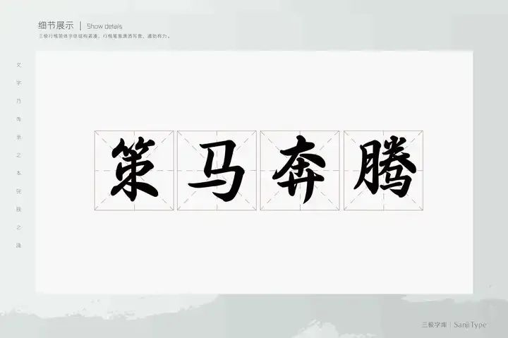 三极行楷简体,是一款免费商用的行楷字体。字体结构紧凑,笔画潇洒写意,遒劲有力,大气隆重。适用于国潮经典、传统节日的主题排版,以及商业类品牌的广告设计、媒体标题以及社交网络个性化用字。