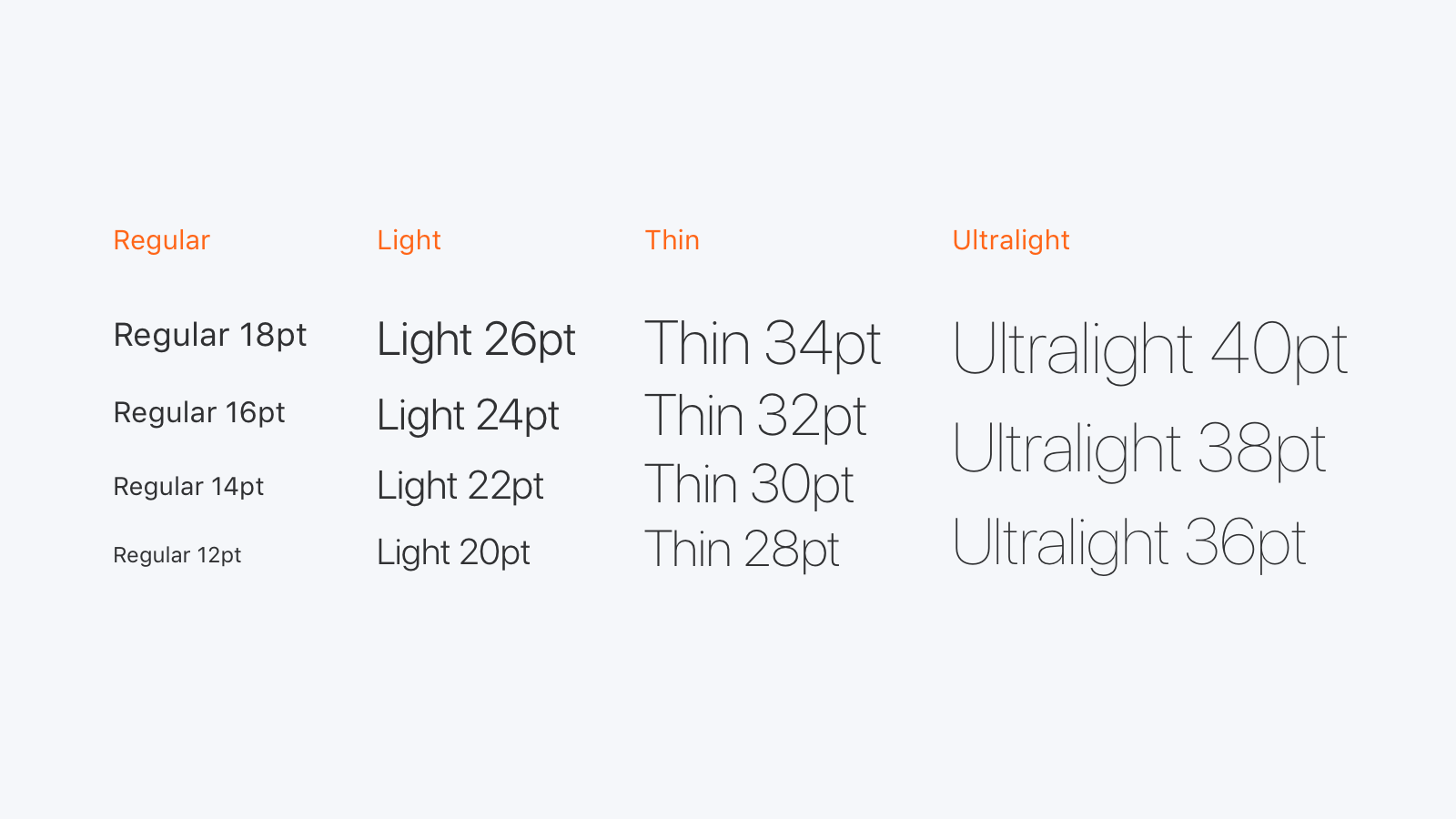当字号大小为 12-18pt 时,使用 Regular;20-26pt 时,使用 Light;28-34pt 时,使用 Thin;当字号大小超过 34pt 时,建议使用 Ultralight。
