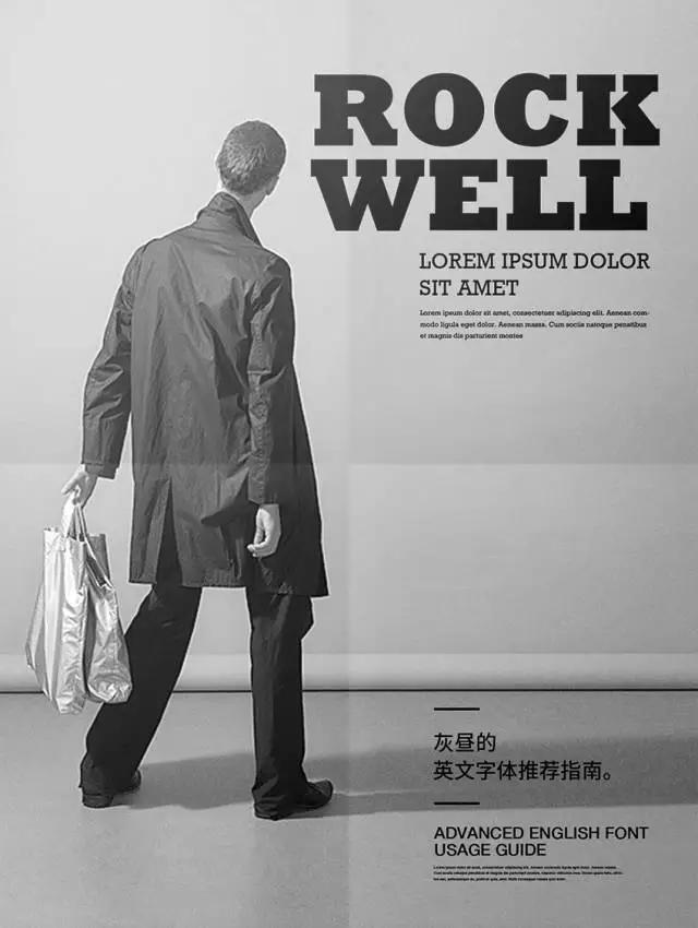Rockwell是一款粗衬线字体,属于衬线字体的一种,特点是衬线相当的粗大。这类字体比其他几类少很多,系统自带的打字机字体Courier也属于此类。Rockwell的bold字重孔武有力,非常适合标题排版。