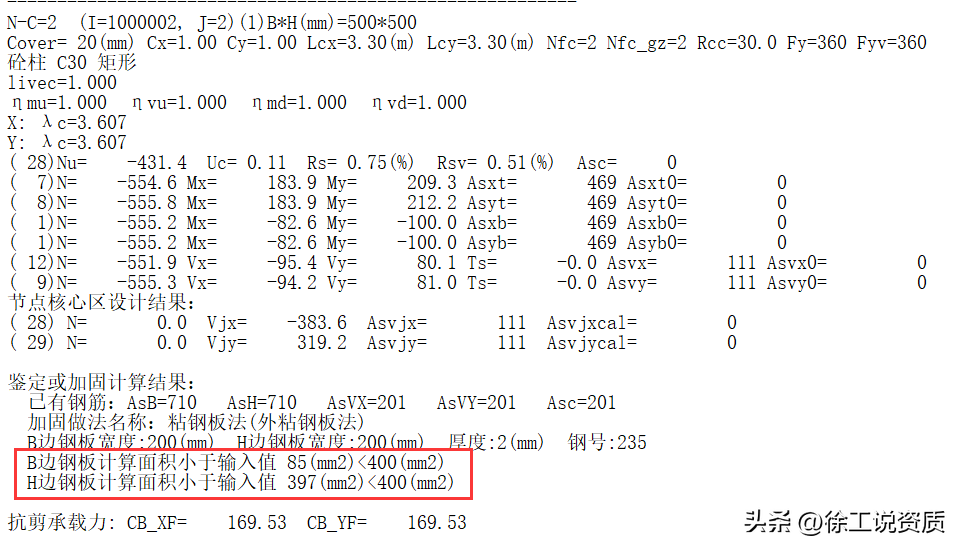 当括号前的数字大于括号内的数字,即计算所需钢板的面积大于输入实配钢板的面积时,柱结果就会显红,表示此加固方案不合适,需要调整加固方案。对于钢板面积不足,可以加大钢板的宽度或厚度,或者改变加固做法也可以。