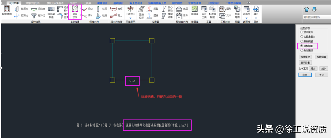 软件能识别柱子为非对称加固,所以,输出的新增钢筋面积只需配在增大的一侧范围内即可,如下图所示: