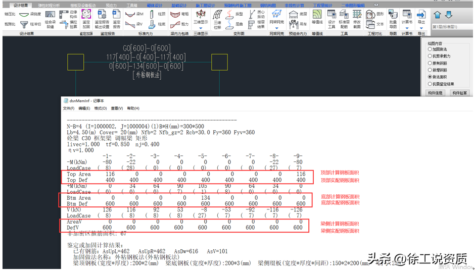 当括号前的数字大于括号内的数字,即计算所需钢板的面积大于输入实配钢板的面积时,梁结果就会显红,表示此加固方案不合适,需要调整加固方案。对于钢板面积不足,可以加大钢板的宽度或厚度,或者改变加固做法也可以。