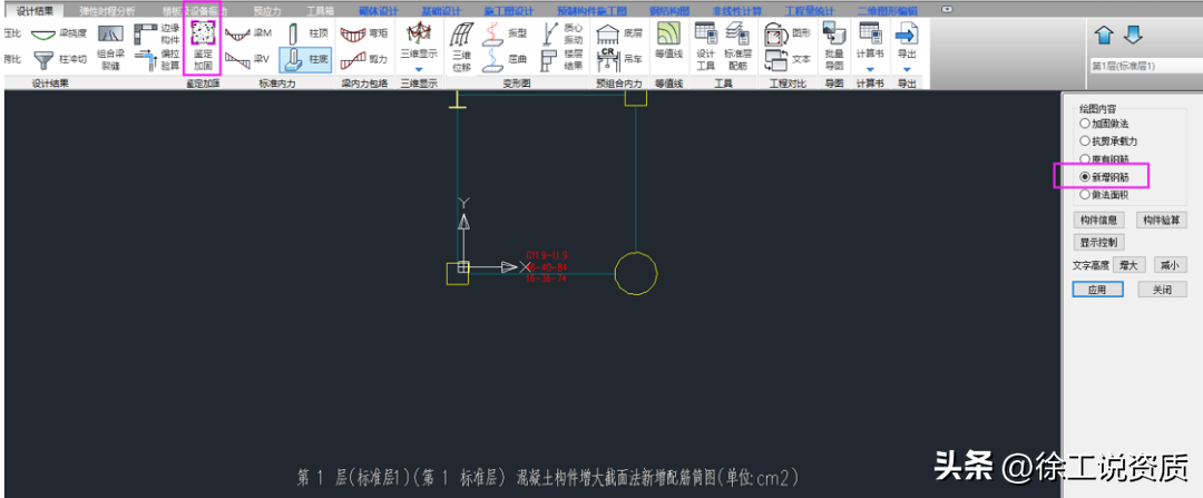 柱增大截面法目前只对正截面进行了计算,没有进行斜截面计算。所以,只输出新增纵筋面积,没有输出新增箍筋与节点核心区箍筋面积,也没输出新增角筋面积。